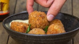 Cuando todo el lote, alrededor de 40 bolas, esté listo, dales otra capa de clara de huevo y pan rallado “panko”.