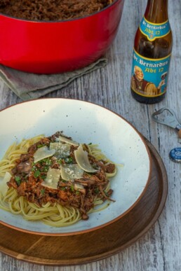 1,2 kg de estofado de jabalí, 2 dientes de ajo, 2 cebollas, 4 zanahorias, 3 palitos de apio, mantequilla, pimienta, sal, 70 g de concentrado de tomate, 5 dientes, 1 punta de cuchillo de nuez moscada, 1 rama de canela, 5 bayas de enebro, 3 palitos de tomillo, 2 botellas de St.Bernardus Abt 12 33cl, 2 hojas de laurel, 4 cucharadas de mostaza, 4 cucharadas de mermelada de grosella, panes para 2 sándwiches, unas ramitas de perejil, unos 75 g de pasta (linguini) por persona, queso parmesano