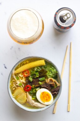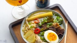 Para esta receta, hemos elegido una versión sencilla del shio ramen, con verduras, pollo (o pescado) y algas marinas, que se sazona con sal (shio significa sal en japonés). El sabor refrescante, ligeramente amargo y lupulado de nuestra St.Bernardus Tokyo contrarresta la salinidad del shio ramen y marida a la perfección.